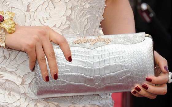 The most expensive Cleopatra Clutch belongs to Chinese actress and singer Li Bingbing. Her custom-designed bag is decorated with 1,600 white diamonds totaling 40 carats, perfectly matching her gown. To make it even more special, her name is spelled out in pink diamonds and pink gold.